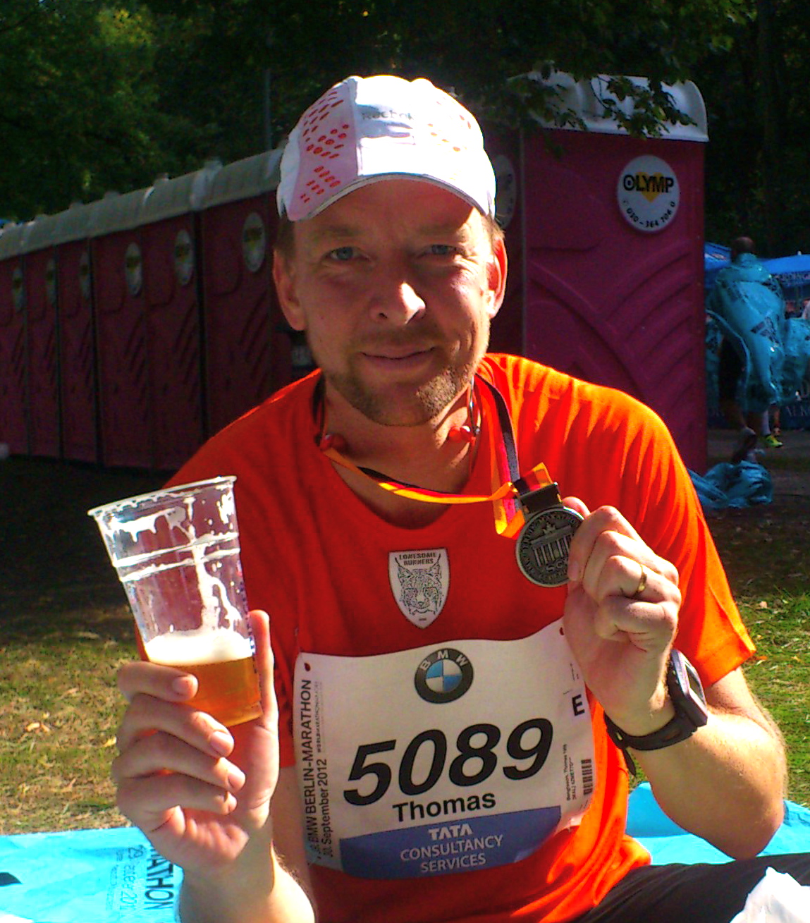 Jag tackar honom för den förtjänstfulla hjälpinsatsen och ber honom varje gång han frågar om han kan släppa att hålla en stund till. Yrseln avtar sakta och jag påbörjar Golgatavandringen bort mot påsutlämningen och Erdingertälten. Vaggar fram, nöjd som få, med min medalj runt halsen och det erhållna, blåa plastskynket över axlarna. Hämtar min klädpåse, hugger en öl, slår mig ner på gräset, skålar med grannen på filten bredvid och mår riktigt, riktigt, riktigt bra!